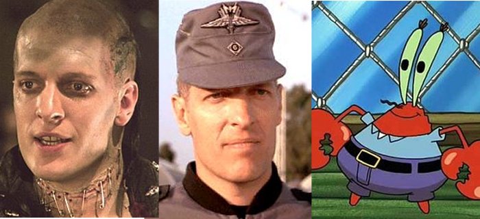 “Wait!” You object. “Cartoon characters? That’s not fair.” I respect your opinion. Also? You’ll hate this next one: more Spongebob. The voice of one of my personal heroes, Eugene H. Krabs, is none other than the rich, deep baritone of Mr. Clancy Brown. That’s the same Clancy Brown that gave life to The Kurgan from “Highlander” and Sgt. Zim in “Starship Troopers.” Clancy is awesome, and die-hards will also remember him from one of my all-time favorites, “The Adventures of Buckaroo Banzai.” The problem with an actor like Clancy Brown is that I quickly run out of space for pictures of his various roles. That’s a good thing.