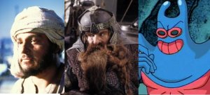 Now you’re impressed, aren’t you? How ’bout a couple of tri-fectas? True fanboys already know, but here are some heavyweight character actors. Jonathan Rhys-Davies, for example. If you’re my age (um, older than forty. Gulp.) then you probably first ran across this likeable Brit in “Raiders of the Lost Ark” and “Last Crusade” in which he played Indy’s sidekick Sallah. If you’re not yet qualified for AARP, however, you probably know him from his roles in the “Lord of the Rings” franchise. Yes, I said “roles” because not only did he portray Gimli the dwarf (i.e., comic relief) he also voiced Treebeard the Ent (i.e., environmental message.) Oh, and he’s also the voice of Spongebob villain Man Ray. True story.