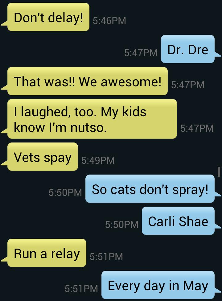 Okay, so this is kinda stupid, but I thought I’d share it anyway. My Sweet Baby and I use text-messaging a lot. A whole lot. People that have never grasped the benefits of texting have never been at a car lot doing a radio station remote for three hours. See, in addition to killing time in a non-distracting way, it also makes communication easier and more discreet. Nobody wants to see a jock (that’s what radio people call themselves) chatting away with a phone to his/her ear for long periods at a time. And make no mistake: over-texting and fiddling with your phone still pisses some people right off, so when in a public setting, please…use discretion.