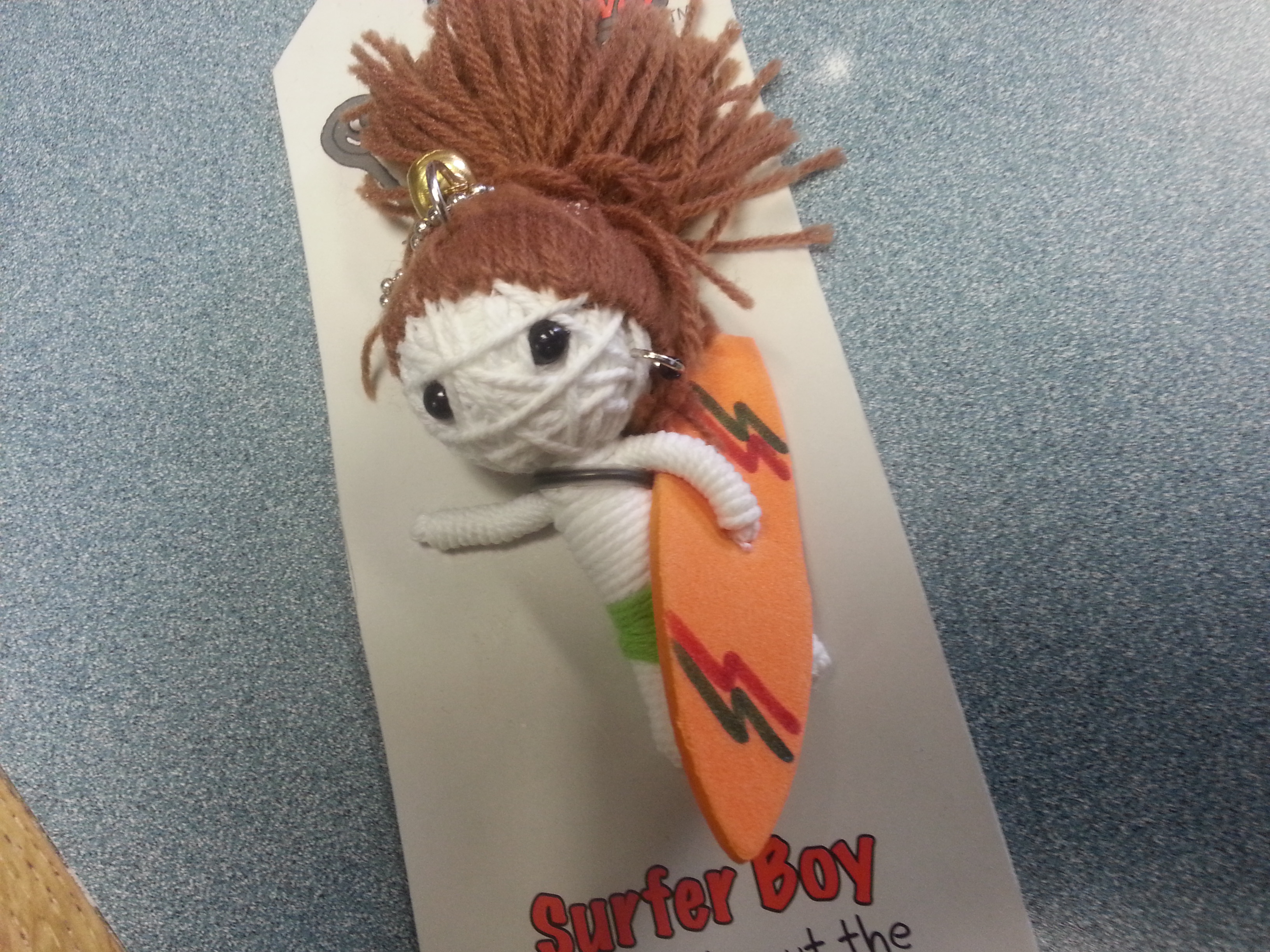 That right there is a little voodoo keychain guy that my Sweet Baby got me on one of her travels because she knows I miss surfing. She’s a good ol’ gal, that wife of mine. Anyway, the other day I noticed something horrifying. Apparently, my little surf guy was a proud member of Hitler’s Waffen SS. Take a look at the board…