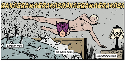 I have my friend, the brilliant and handsome Professor Tony DiSanto, to thank for recommending the most recent iteration of the Hawkeye character. Prior to the moment when he said “DO IT, ASSHOLE! PICK UP THIS BOOK!” (I may not remember Tony’s exact words with 100% accuracy, but it was something like that) I honestly didn’t give two shits. Hawkeye was always the “trick arrow” guy and stupid. His mask was designed to look like Wolverine’s, only it had a big “H” on the top. Seriously, Marvel? You took Captain American’s “A” and made it a consonant and…those stupid cuffed pirate boots…and…and a hover-scooter…and…just no. How about no? NO. I mean, sure, I enjoyed Jeremy Renner’s interpretation of the character, and in retrospect think they should have used him better in Joss Whedon’s blockbuster flick. But overall, there just wasn’t anything about the dude that drew my attention.