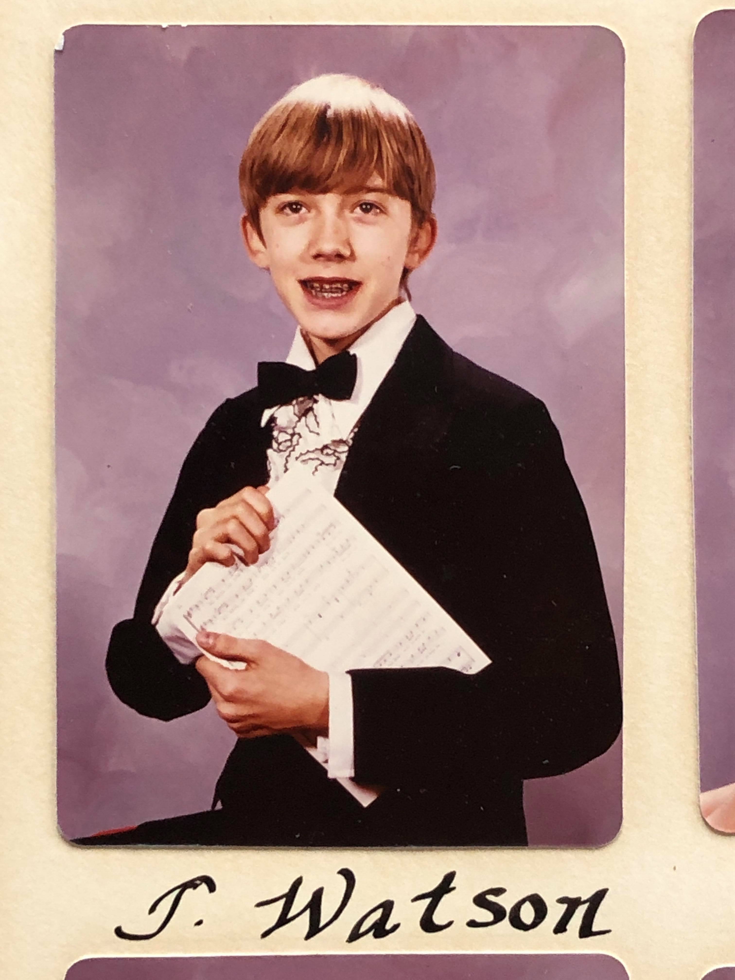I’m submitting a couple of photos here as visual evidence of my transformation, by the way. The first photo (thanks to Patti Liberti Green for unearthing this horrific gem) was me doing some sort of band or choir shoot from the 1984-85 school year. Lots to unpack there. The tux…the ill-fitting shirt and bowtie…the teeth, wrapped in bands of steel…the greasy hair in a traditional Amish bowl cut (I am not Amish)…the Smeagol grip on the sheet music. The eyes looking up and away…afraid of the camera, kid? It’s like the photographer said “fuck it. This will do.” Oof.
